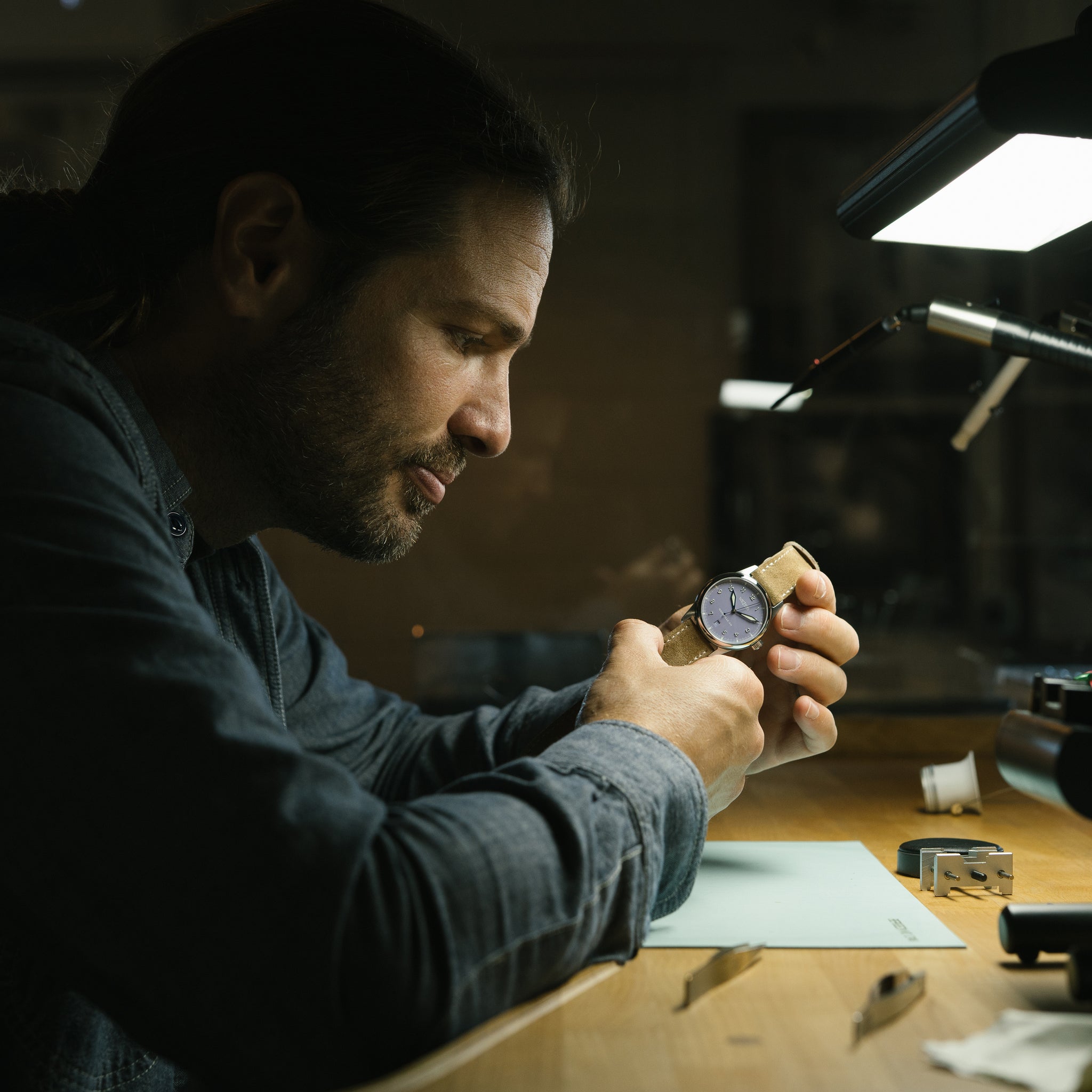 Each watch is paired with a tan suede strap—supple, warm-toned, and designed to develop character with age. From machining to hand assembly to final regulation, every component is completed with care in our Nashville workshop.