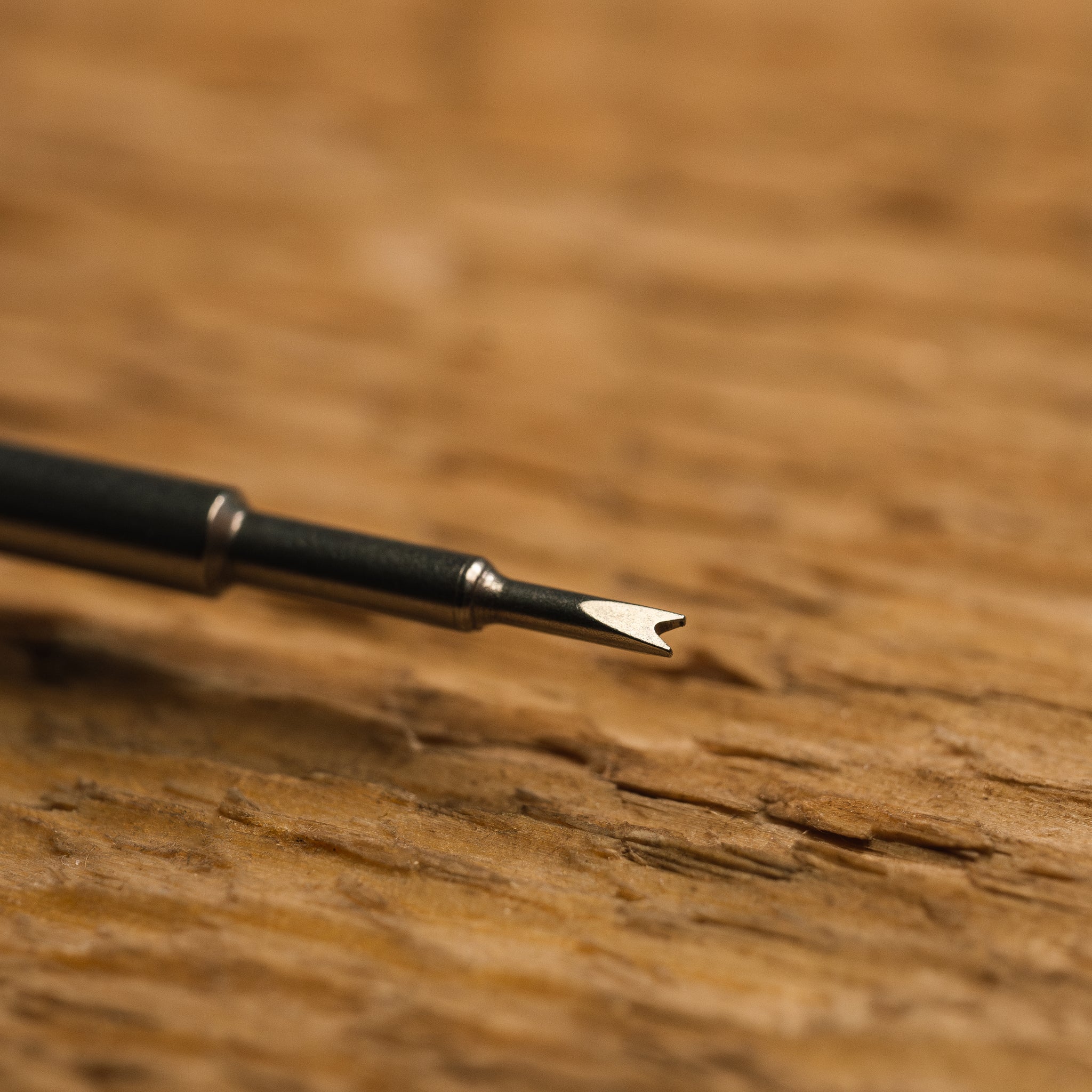 Our strap changing tool comes with one fork end tip for removing the strap from the watch and one straight tip for removing the buckle from the strap.